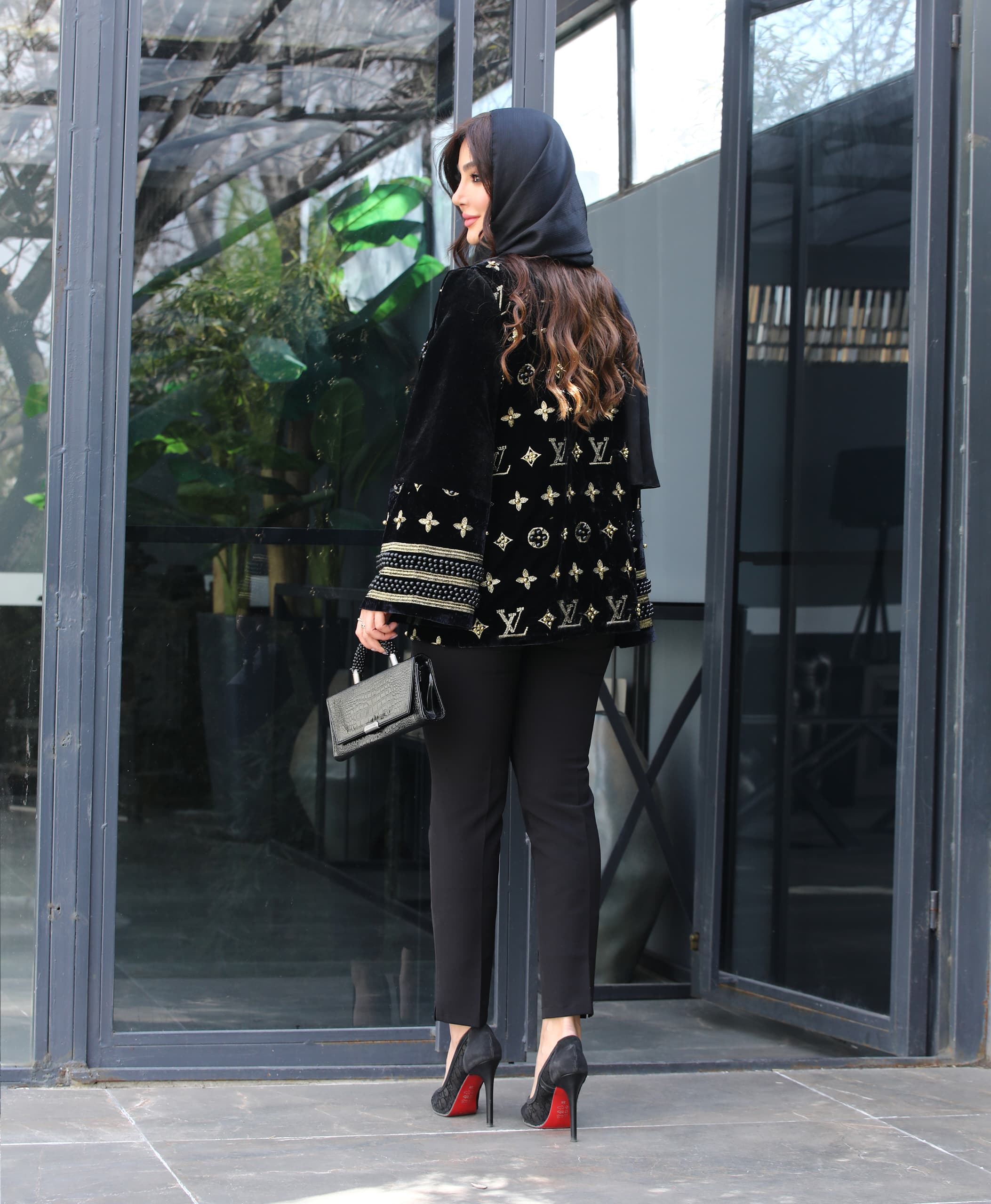 کت زنانه مجلسی مخمل مشکی با جزئیات طلایی طرح لوکس و خاص