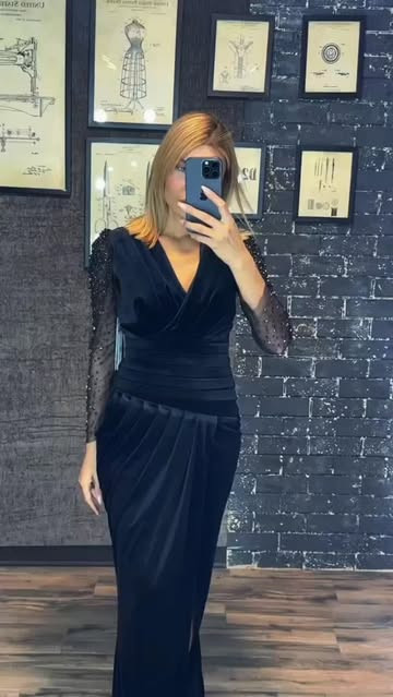 مدل "خط سکوت" با یقه V کلاسیک، چینهای ظریف در قسمت میانی، و سنگدوزی درخشان روی سرشانهها، انتخابیست برای بانویی که به دنبال جلوهای آرام، عمیق و خیرهکننده است.